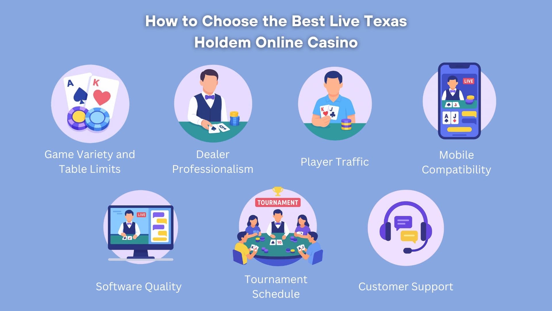 Remember, what you like best is what matters most. Some players love the social chat, others prefer lots of game choices or juicy bonuses. Figure out what's most important to you in a live Texas Holdem experience and pick your casino based on that.